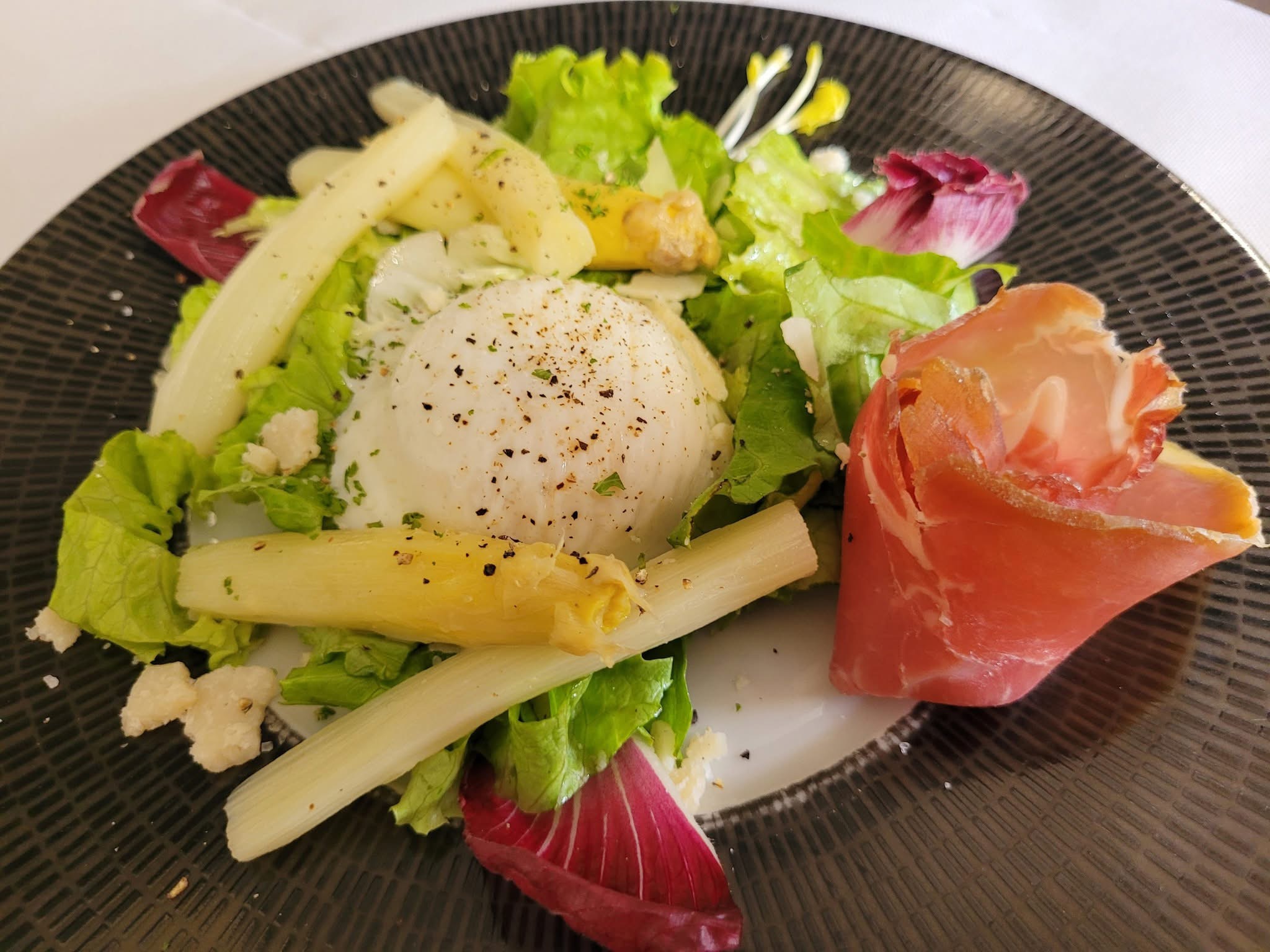 Salade d'asperge, oeuf mollet, parmesan et jambon de Bayonne