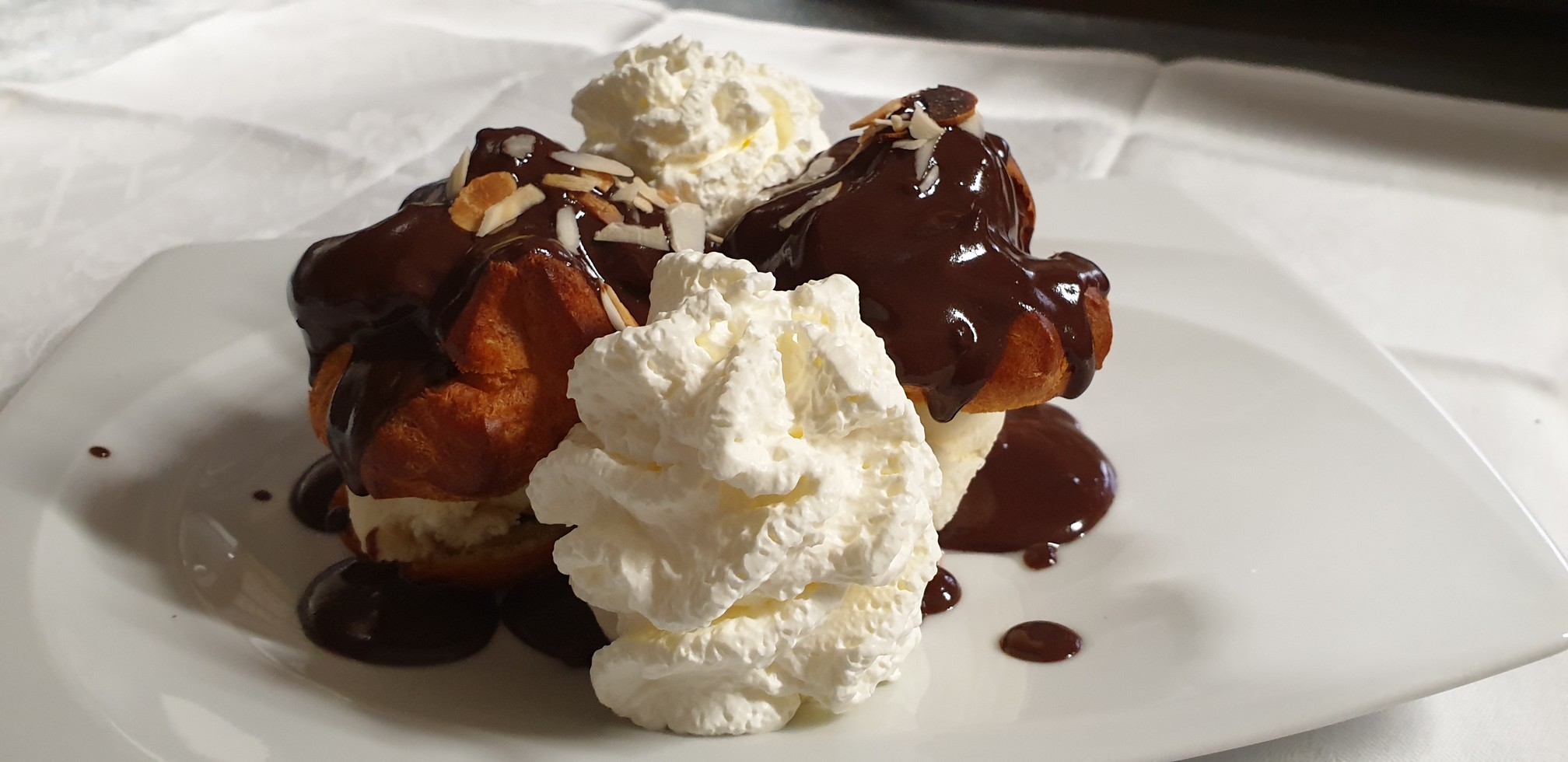 - Poire Belle-Hélène : glace vanille, poire pochée, crème fouettée 9 €